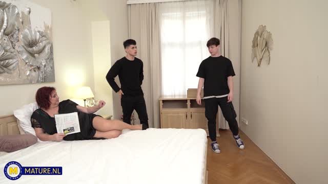 Skinny GILF has threesome sex with two hot younger men!